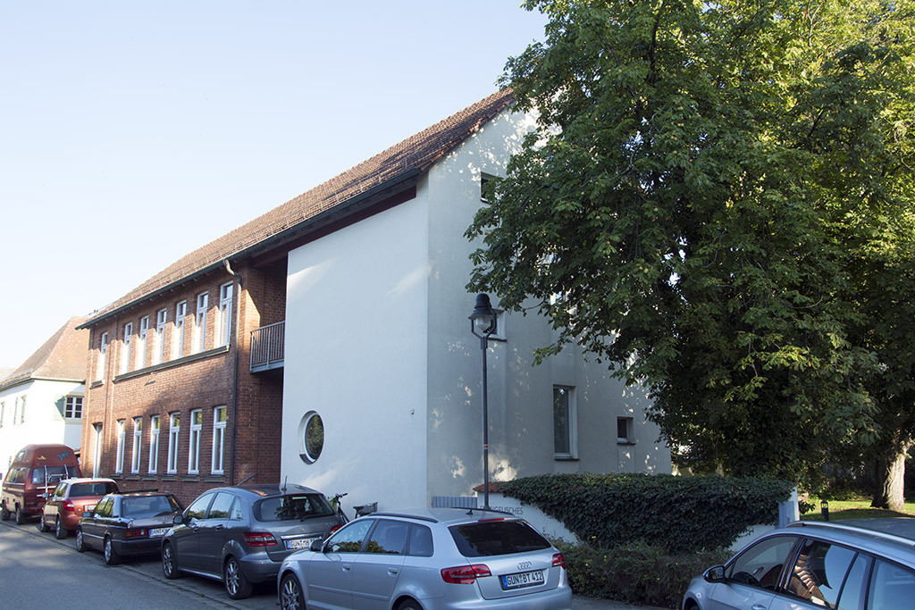 Das Gemeindehaus enthält im Erdgeschoß den Gemeindesaal, eine Teeküche, Garderobe und Toiletten. Das Erdgeschoß ist über den Garten barrierefrei erreichbar.