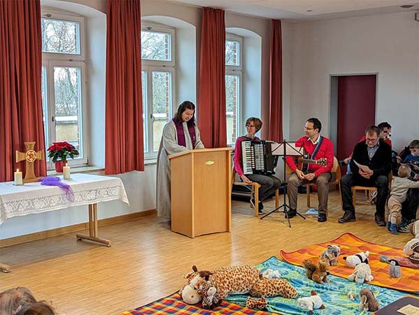 Zu unserem ersten Gute-Zeit-Gottesdienst fanden sich rund 40 Besucher im Gemeindehaus ein und genossen einen kurzweiligen Gottesdienst, während unsere ganz kleinen Gemeindemitglieder sich mit den auf Decken bereitgelegten Stofftieren beschäftigten. Unsere Dekanatsjugendreferentin wurde dabei musikalisch von Familie Uhlmann unterstützt. Anschließend war genügend Zeit, um bei Kaffee,